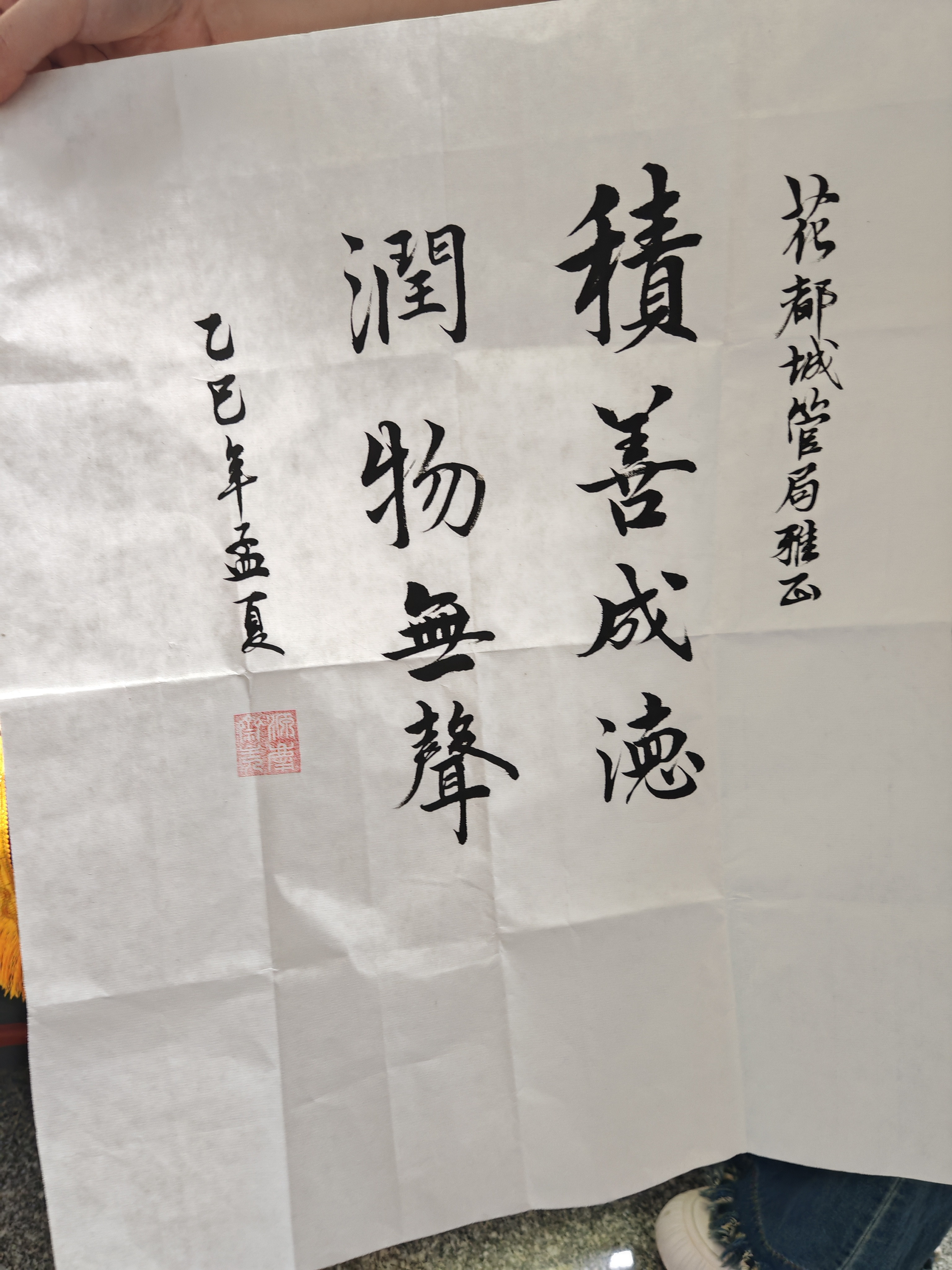 在花都区城市管理和综合执法局办公室,小区居民代表向工作人员递上锦旗和一幅书法作品,“积善成德 润物无声”八个大字笔力遒劲,代表着小区居民对城管工作的肯定。花都区城市管理和综合执法局相关负责人表示,下一步将继续指导属地炭步镇加强小区燃气安全管理工作,督促燃气企业加强日常管线巡查,落实入户安检、隐患排查整改等工作,守护小区居民用气安全。