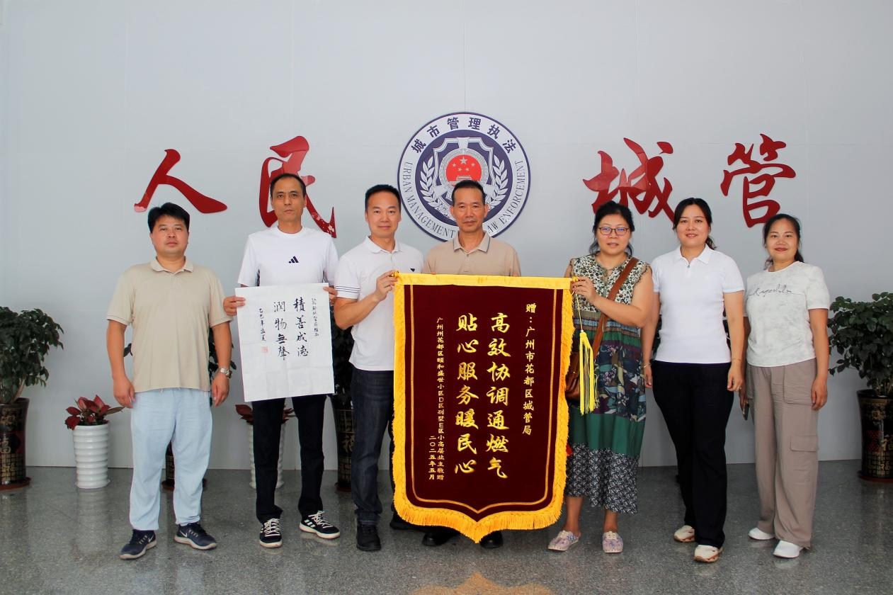 2025年5月底,花都区炭步镇颐和盛世小区居民代表到花都区城市管理和综合执法局送上印有“高效协调通燃气 贴心服务暖民心”的锦旗,以此感谢花都城管帮助该小区居民解决了困扰多年的管道天然气开通难题。